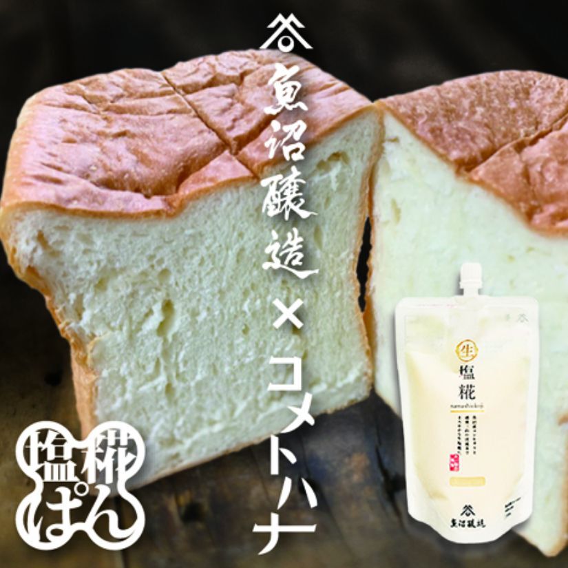 魚沼醸造の「生塩麹」を使った塩麹食パンを商品化しました! ⿂沼醸造の⽣塩糀は、ブランド⽶「⿂沼産コシヒカリ」と越後三⼭の良質な伏流⽔を使った、まろやかで⾃然の旨味が特徴です。塩の代わりに塩糀を使⽤、ほのかな糀の⾹りと⼩⻨の⾹ばしさが引き⽴つ旨味、もちもちの⾷感で、そのまま⾷べてもトーストしても、バターいらずの美味しい⾷パンができました。