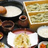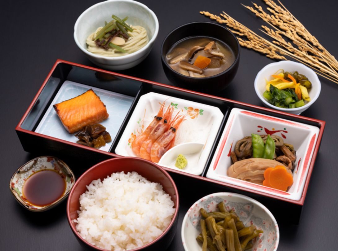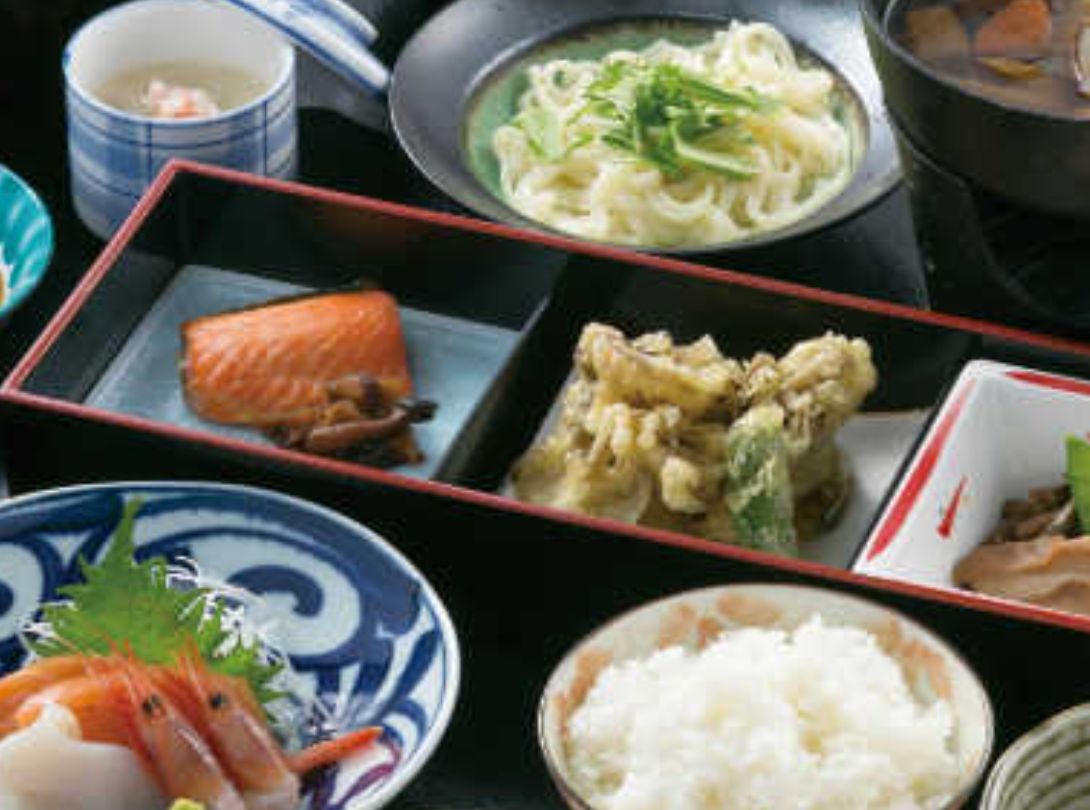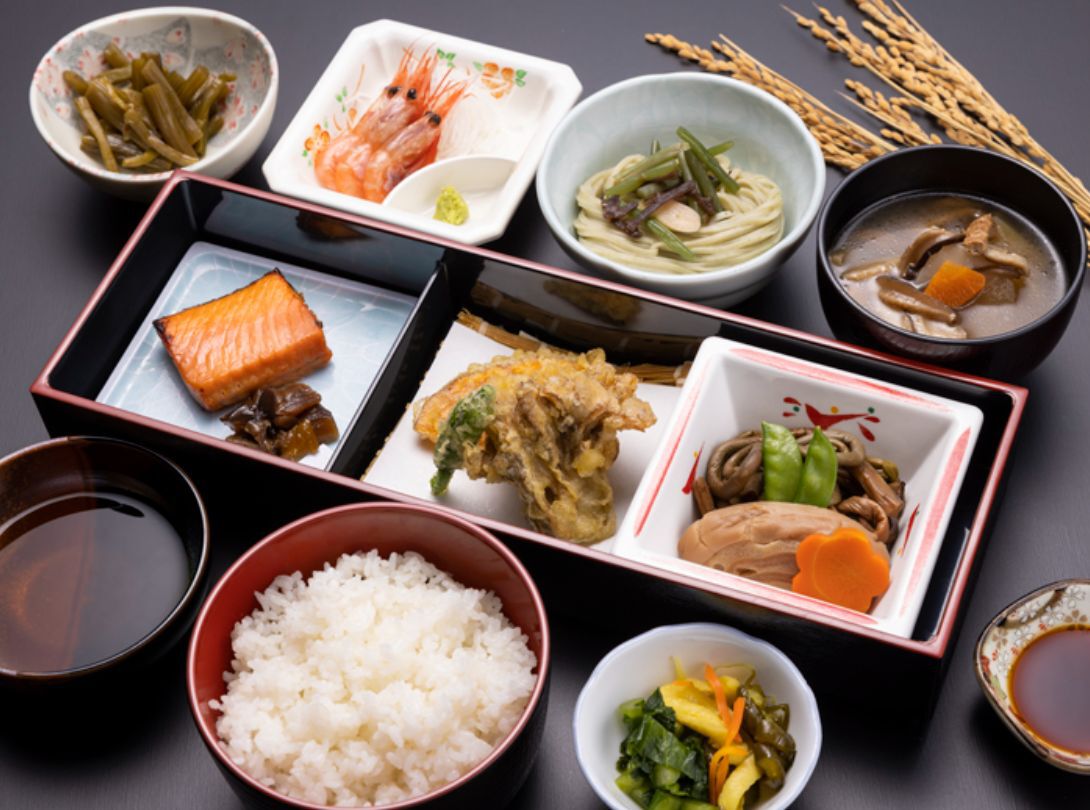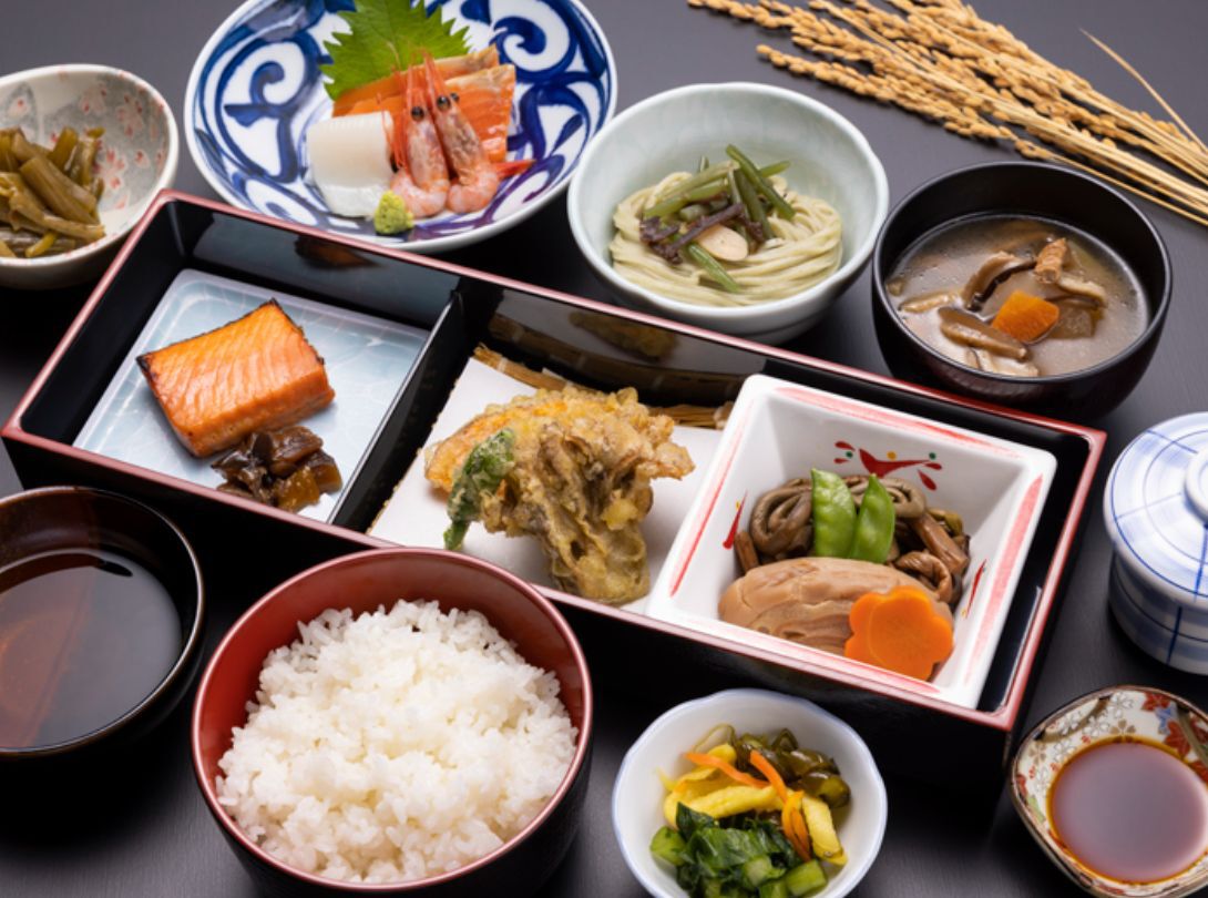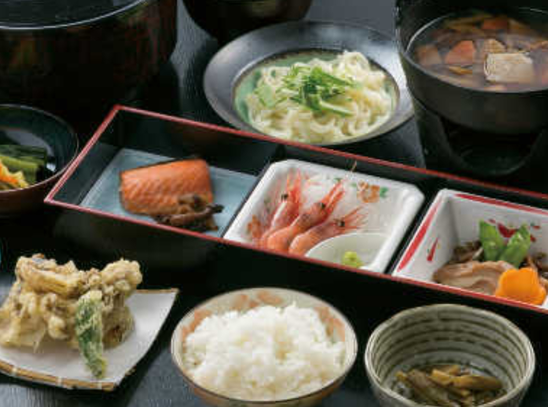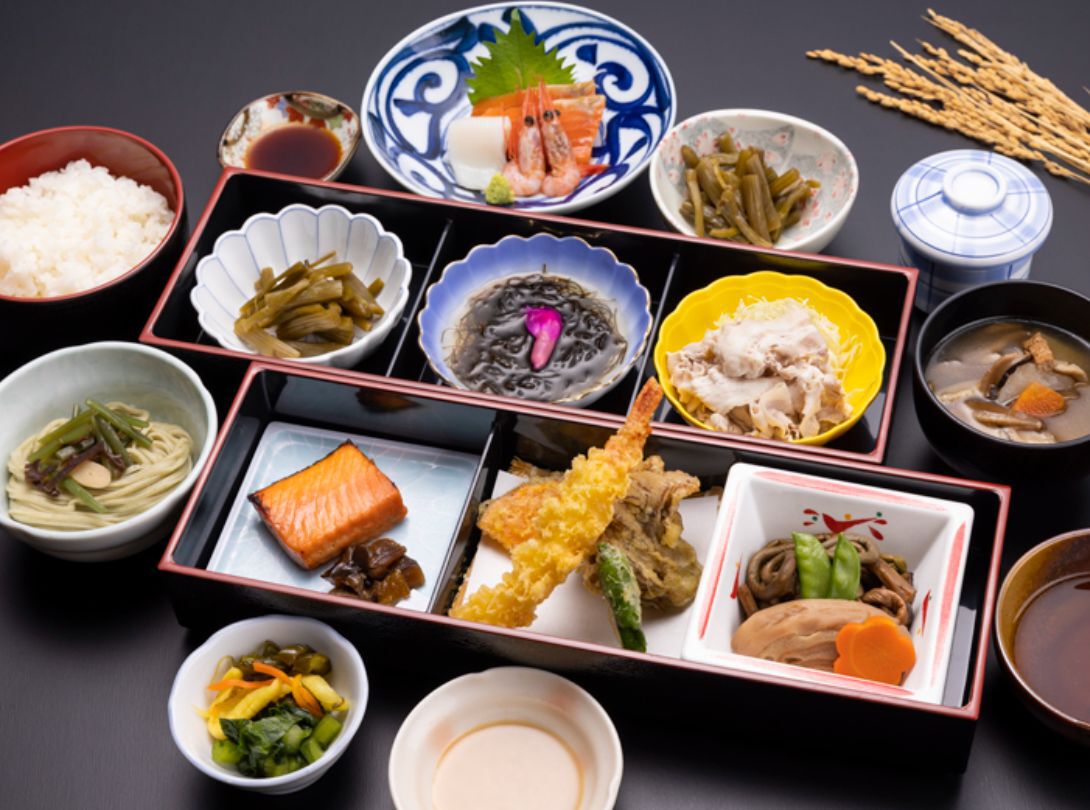 自家製 魚の越後味噌漬焼・越後名物車麩とぜんまいの煮物・季節の小鉢・季節のお漬け物・山菜そば 十日町妻有そば使用・越後名物けんちん汁・地元まいたけと季節野菜の天ぷら・魚沼産コシヒカリ食べ放題・地元野菜の茶碗蒸し・鮭のたたき他お刺身三点盛り(内容及び金額は仕入れの都合により変更する場合がございます。詳しくはお問合せ下さい)
