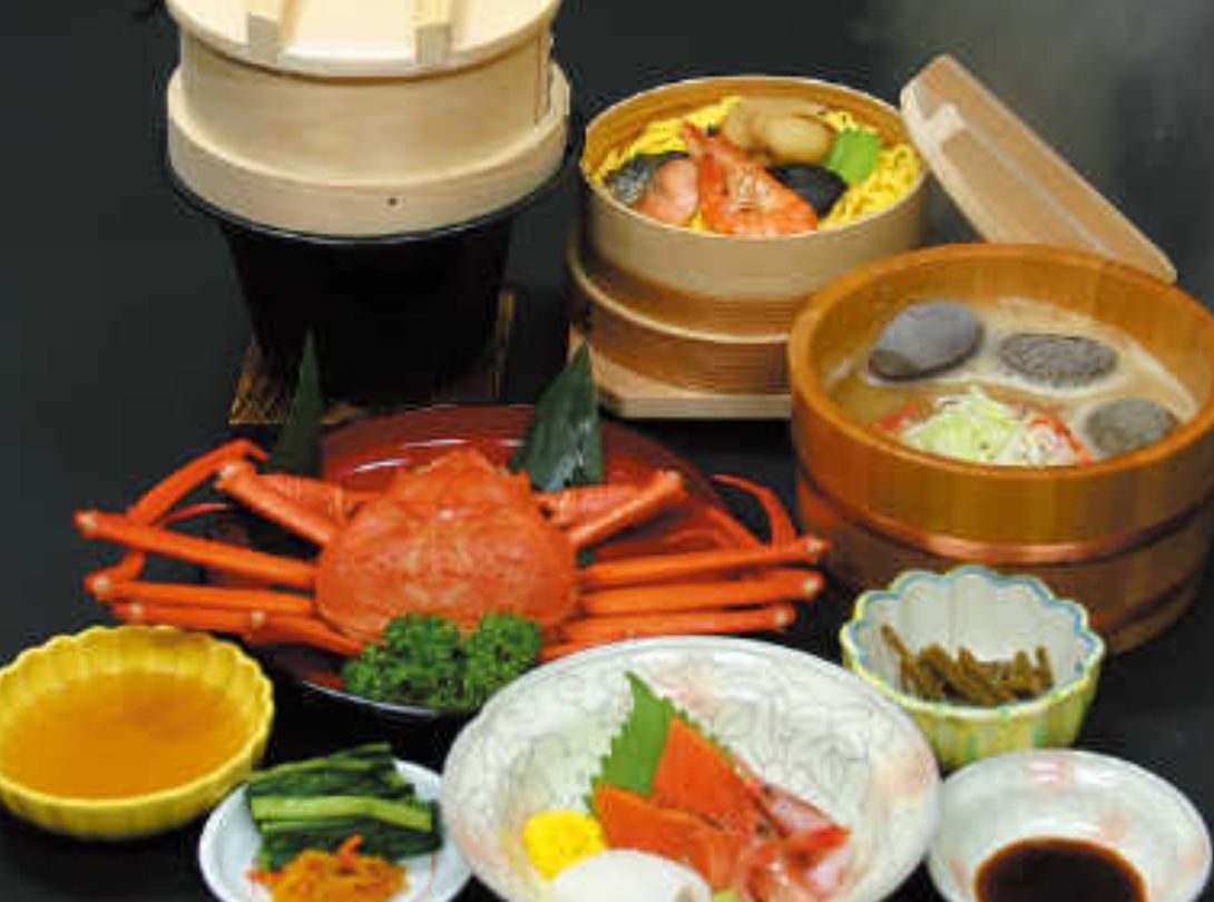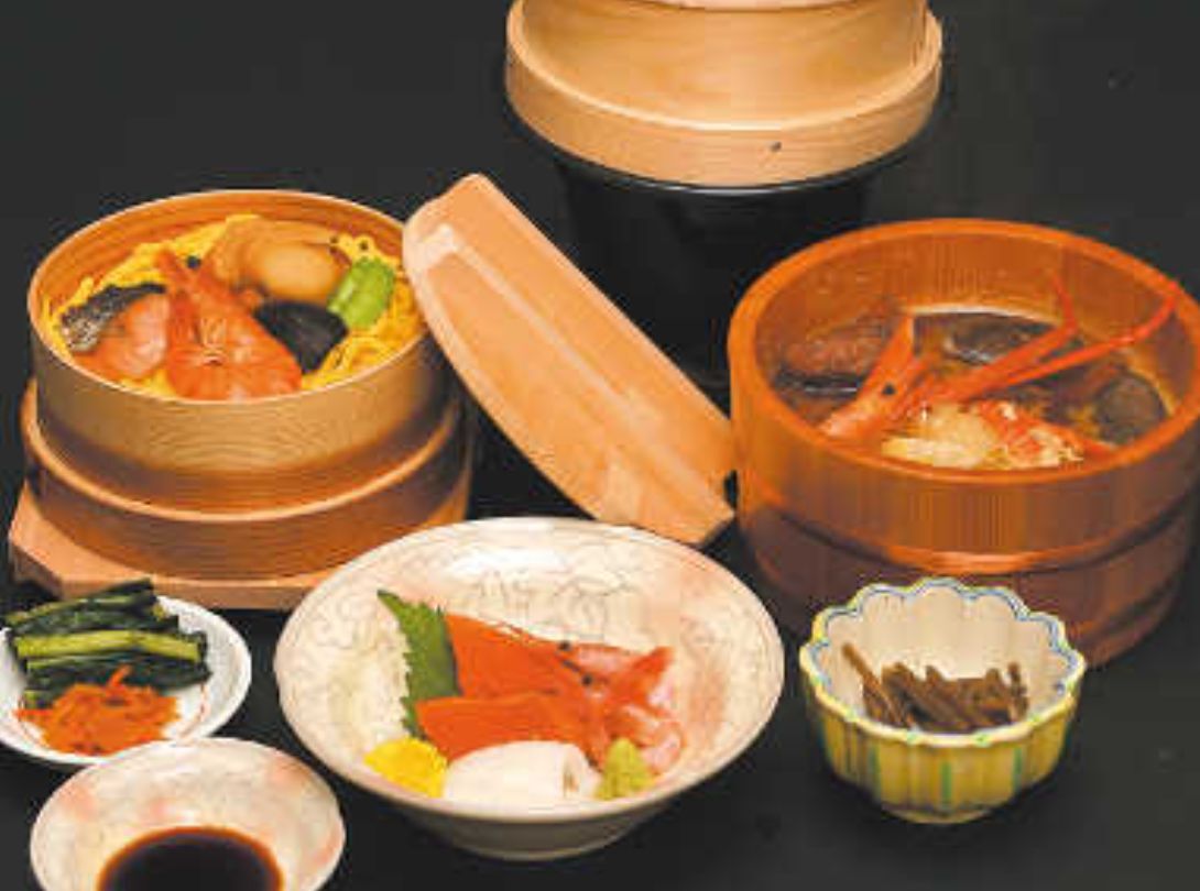 海鮮わっぱめし・わっぱ汁・紅ズワイガニ・旬の刺身盛り・小鉢・お漬物