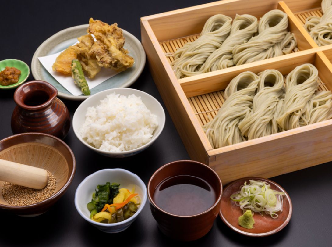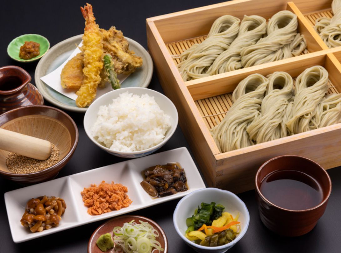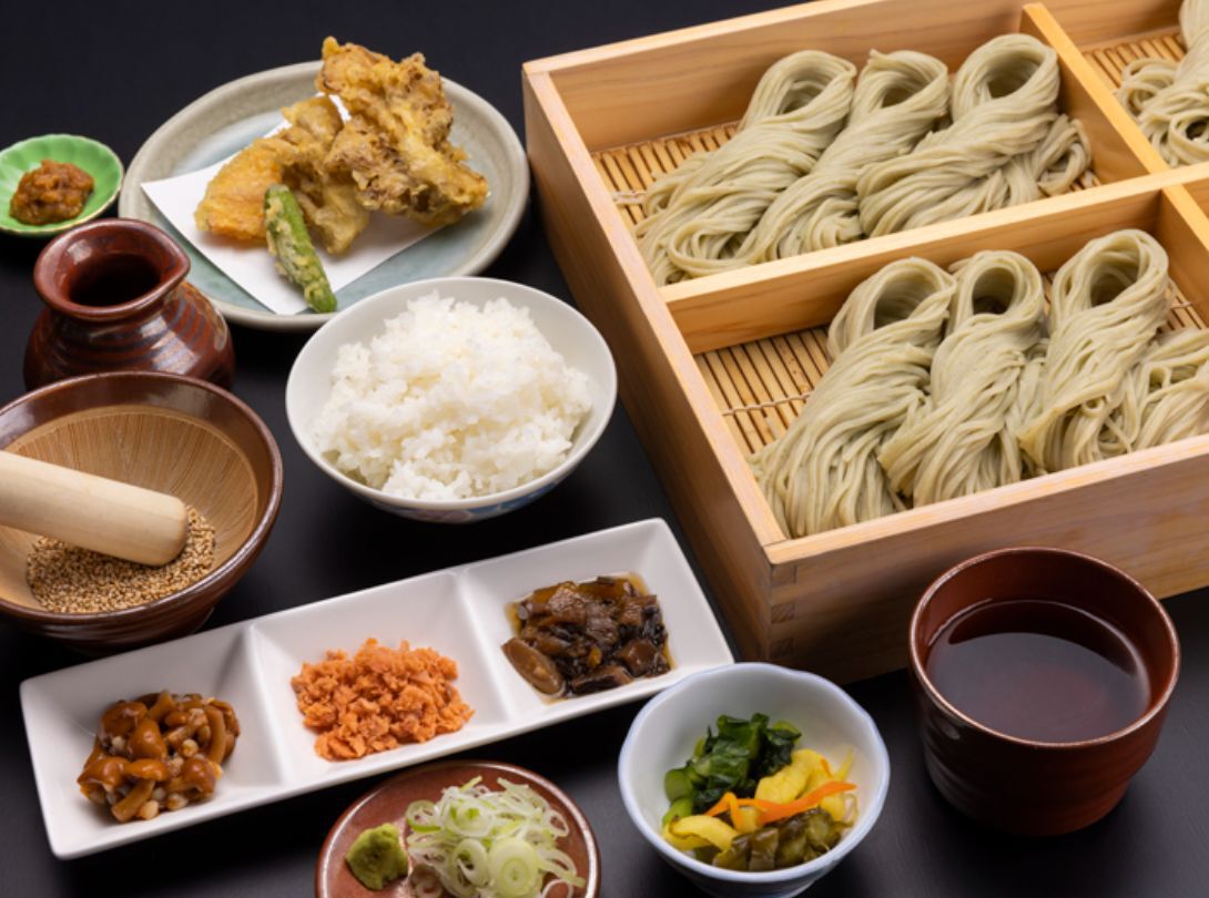 越後名物へぎそば・魚沼産こしひかり・地元まいたけと野菜の天ぷら・お新香・薬味(ネギ・わさび・ゴマ)・板長特製ごはん味噌