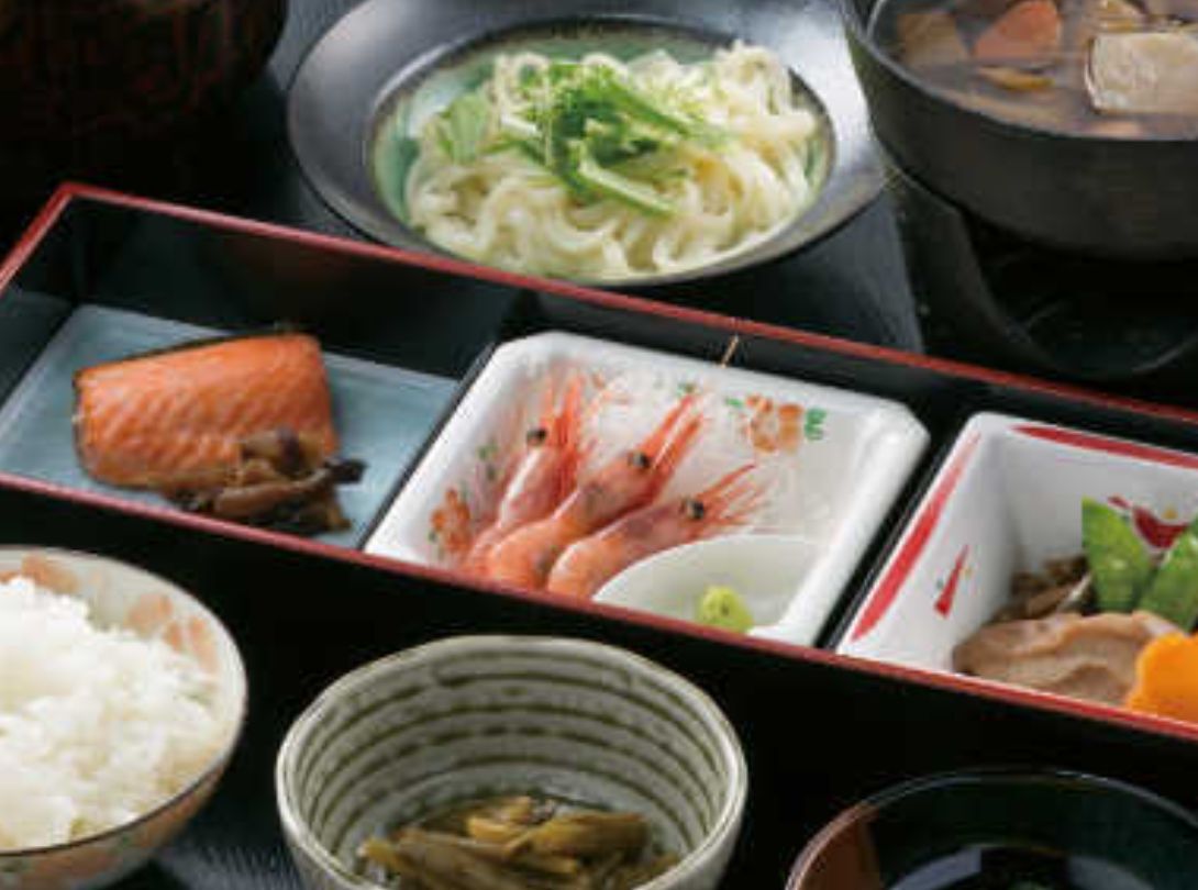 自家製 魚の越後味噌漬焼・南蛮海老のお造り・越後名物車麩とぜんまいの煮物・季節の小鉢・季節のお漬物・魚野の里名物けんちんうどん・魚沼産コシヒカリ「食べ放題」