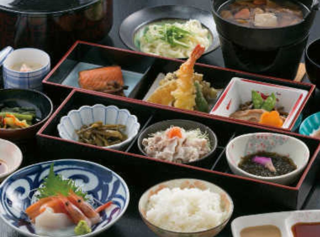自家製 魚の越後味噌漬焼・越後名物車麩とぜんまいの煮物・季節の小鉢・季節のお漬物・地元まいたけと季節野菜の天ぷら・魚野の里名物けんちんうどん・魚沼産コシヒカリ「食べ放題」・地元野菜の茶碗蒸し・鮭のたたき他お刺身三点盛り