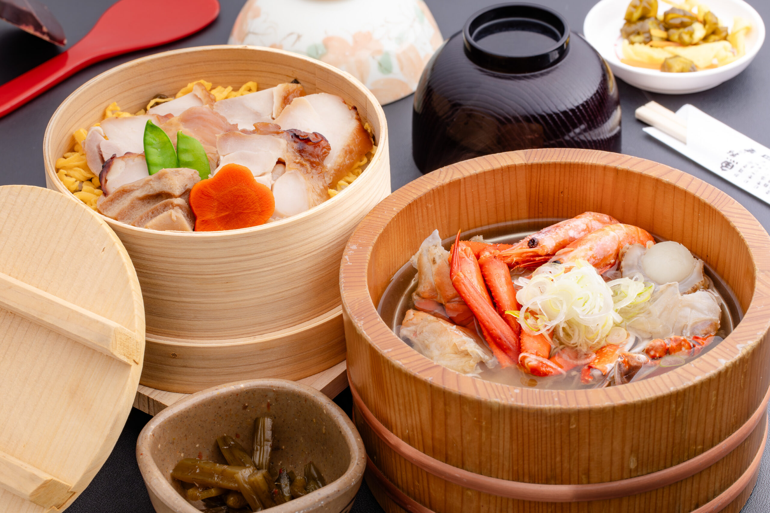 出汁香るご飯に鶏肉や山菜をのせてふっくら蒸し上げる「わっぱ飯」と、海鮮とお味噌が入った器に焼石を投げ入れて瞬時に煮立たせる「わっぱ汁」。どちらも海の幸の旨みが凝縮された逸品です。