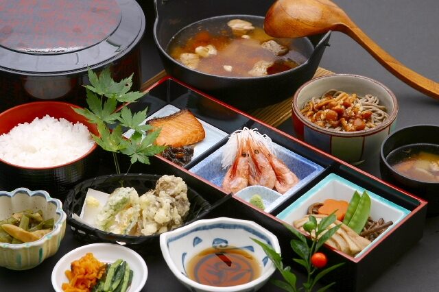 自家製 魚の越後味噌漬焼・南蛮エビのお造り・越後名物車麩とぜんまいの煮物・季節の小鉢・季節のお漬け物・山菜そば 十日町妻有そば使用・越後名物けんちん汁・地元まいたけと野菜の天ぷら・魚沼産コシヒカリ食べ放題 (内容及び金額は仕入れの都合により変更する場合がございます。詳しくはお問合せ下さい)