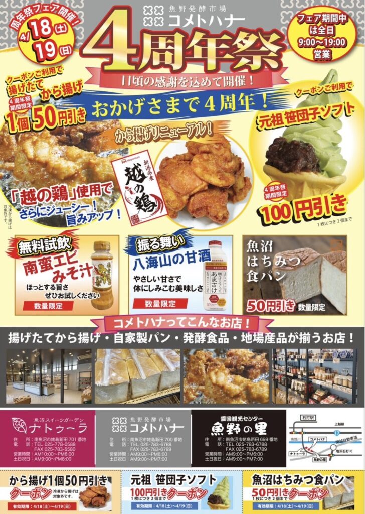 いつもご愛顧いただき、誠にありがとうございます。 地元・魚沼の皆様に支えられ、魚野発酵市場「コメトハナ」は無事に4周年を迎えることができました!