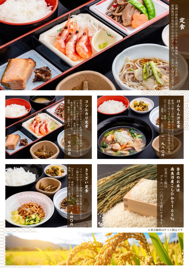 • 主役は「南魚沼産コシヒカリ100%」の定食 当店のお米は、自慢の南魚沼産こしひかり100%を使用しています 。新潟・魚沼の昔ながらのおかずと一緒に、お米本来の美味しさを味わう「コシヒカリ定食」や、郷土料理の「けんちん汁定食」「きりざい定食」をご用意しました 。