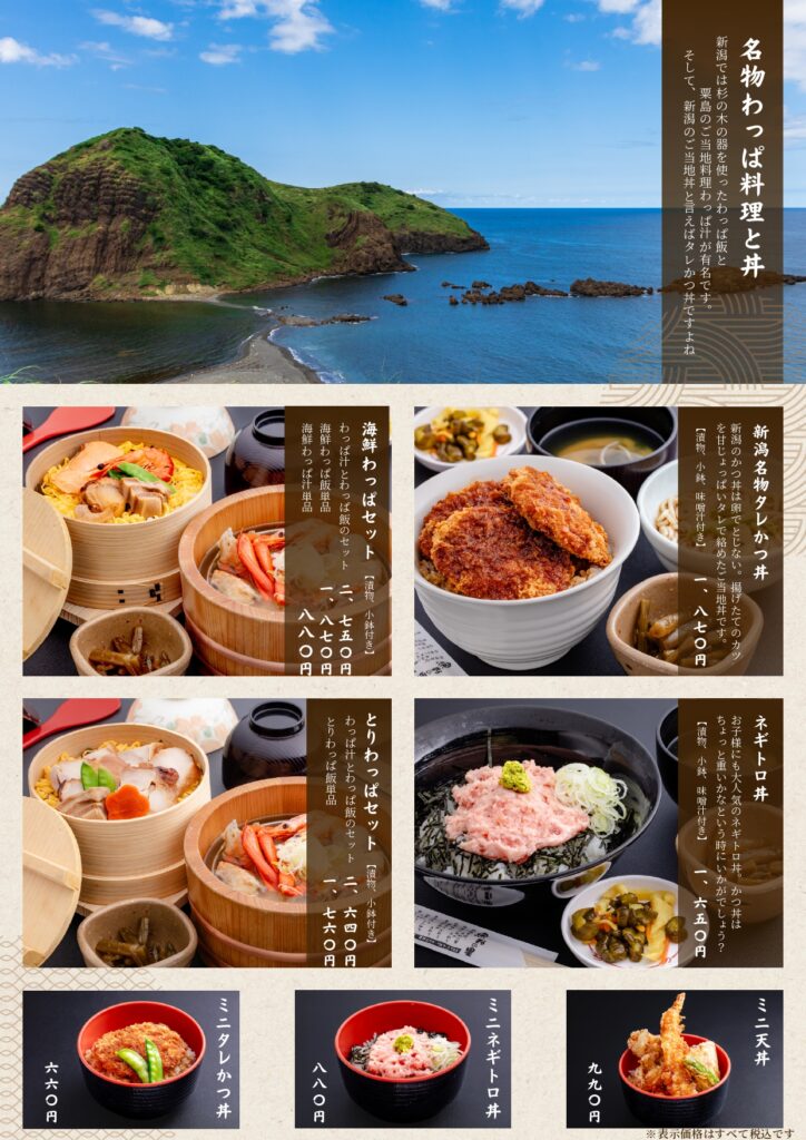 • 新潟ご当地グルメ&名物わっぱ飯 杉の木の器を使った新潟名物「わっぱ飯」や、卵でとじない甘じょっぱいタレがクセになる「新潟名物タレかつ丼」など、新潟ならではの味をご堪能いただけます 。